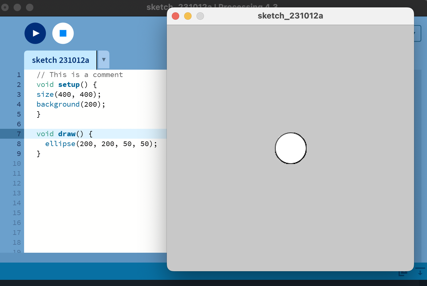 You should see a window with a circle in the center of it. This is because thesize(400, 400) function sets the size of the window to be 400x400 pixels, the