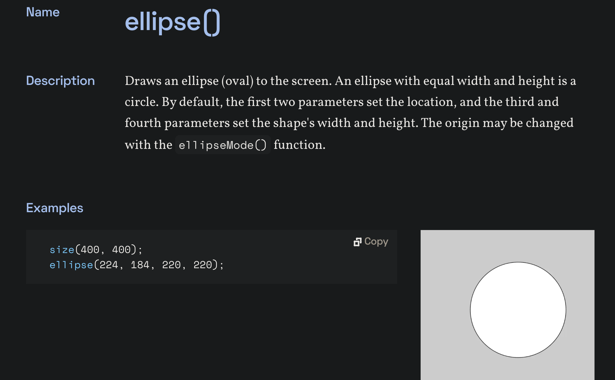 Here, the ellipse() function draws a circle. The